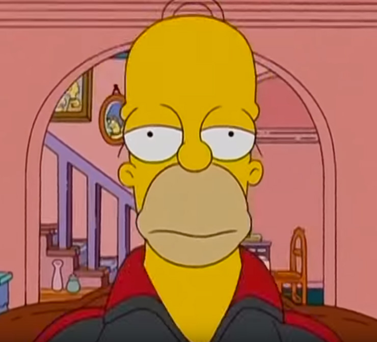 Straight ahead Homer looks strange and lifeless. The symmetry of his hair, head, ears, eyes and nose gives a kind of mathematical rather than human/personal aspect.